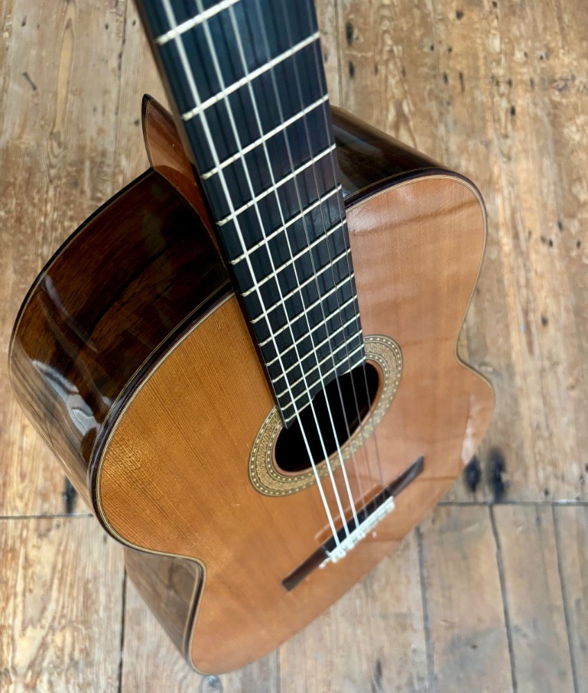 This guitar is in good condition for its year with no cracks or major scratch marks. There are the normal players marks as to be expected and signs of polish ware in patches. The instrument has obviously been well cared over the years and there is no reason for it not to continue being a fine concert guitar and investment. Some modern players like carbon strings on these guitars and they do sound huge with this set up! However, it is also very powetrful and sweet with standard nylon strings. The construction is Paulino's fan grid early wood lattice system. There is full original PB documentation. Must be viewed....