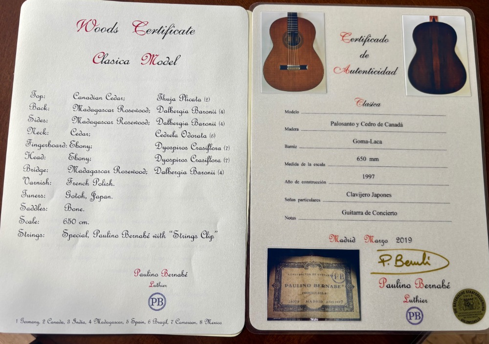 This guitar is made by Paulino Bernabé Senior (1932-2007) from Madrid. Bernabe is considered to be among the rare elite of classical guitar makers. His guitars have been played by many recording artists including Yepes and are admired for their powerful, clear and sustaining sound. Paulino started as a guitar player and studied with Daniel Fortea.
