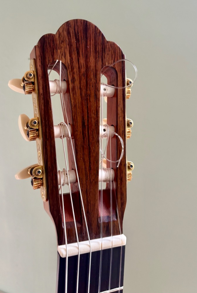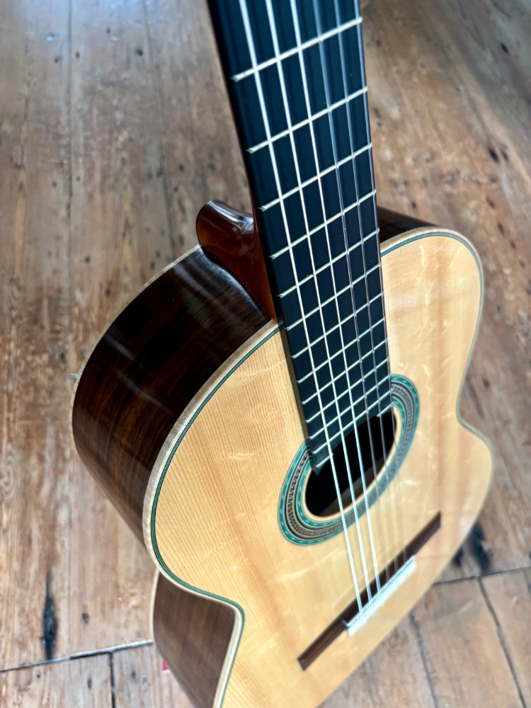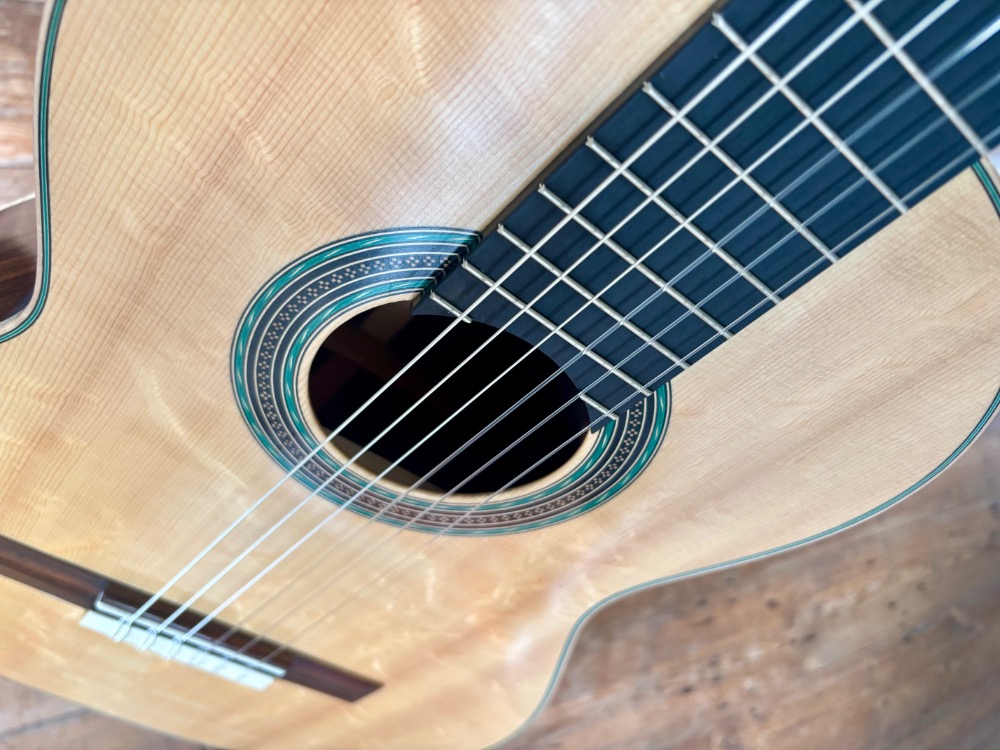A fine guitar built in homage to Antonio de Torres, based on the original guitar he built for Miguel Llobet (FE09). The tone woods are of the highest quality, the top having exquisite bear claw markings. The sound is exceptionally even, open and responsive with fine projection yet always sweet.