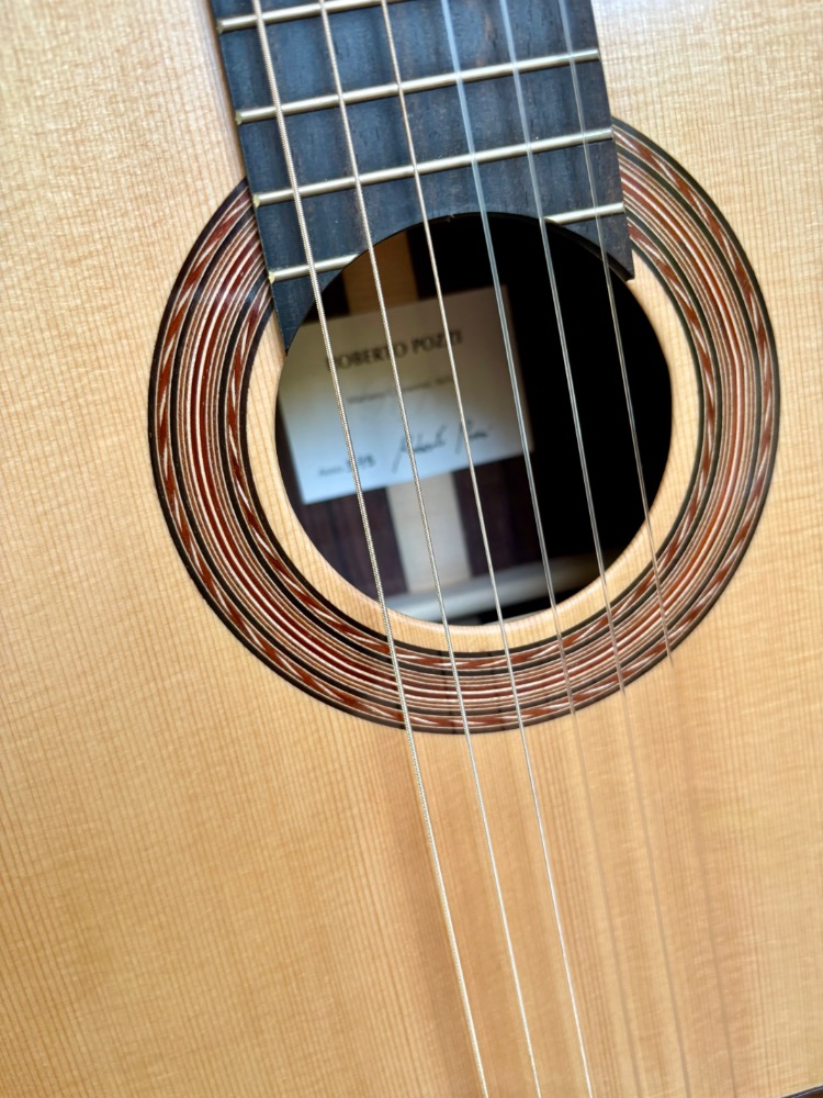 NOW ON SALE - reduced from 3,750.to 2,750. A very classy Italian guitar. Roberto Pozzi is one of a number of young talented Italian luthiers. He is based near Lake Como. His guitars have been profiled in Roma Expo Guitars and have received high praise: https://youtu.be/7gjlqNICM2Q?si=DB7GnQVK1VrovNKS