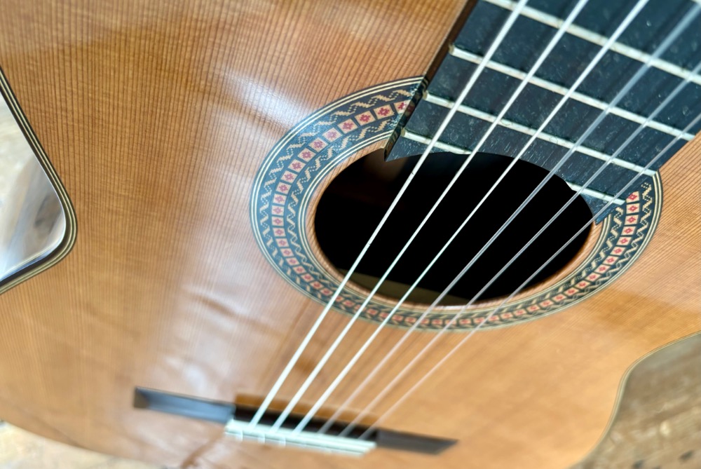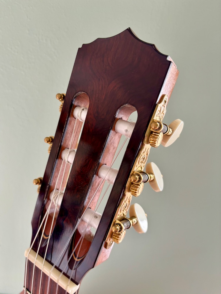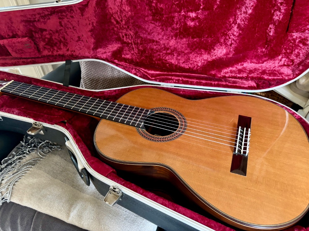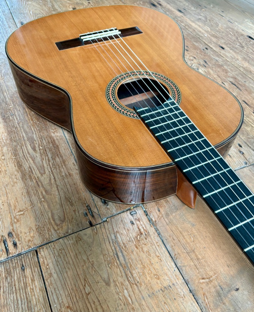 Pablo Requena, originally from Malaga in Spain, made this guitar at his Lewes workshop in East Sussex England. Pablo has now become a well recognised luthier and his new guitars from his new work shop back in Malaga sell for more the £5000. He is also much respected for his films and courses on guitar construction. Here is a chance to own a stunning second hand model in used but sound condition. There are some marks to the top, the neck and a hairline crack to the back. One owner. The woods are of stunning quality. It's very easy guitar to play and rewards the one with quick, powerful, crystal clear Spanish sound. Comes with origina Hiscox hard case. Must be tried. You can find out more about Pablo https://spanishguitar.org.uk/#experience
